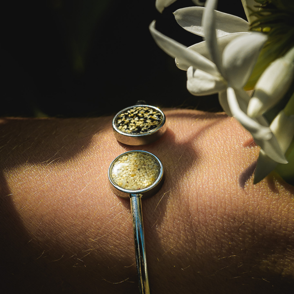 Bracelet réglable en acier inoxydable et sable de la plage de Moya.